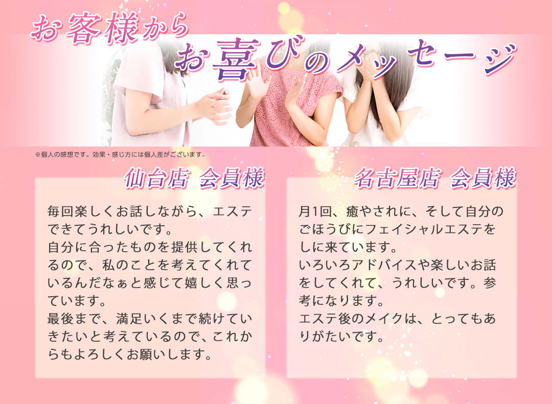 ※中学生以上の方よりカウンセリングおよびエステティックサービスをお受けしておりますが、各種サービスのご提供を希望されるお客様が弊社の定める未成年者基準(18歳の高校生・高専生以下のお客様)に該当する場合は、親権者承諾書のご提出と親権者様の同席が必要となりますので、あらかじめご了承ください。