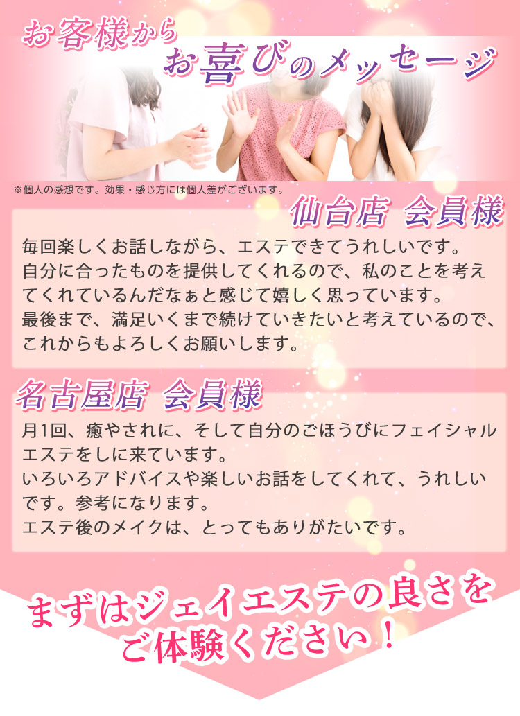 ※ジェイエステティックは全国直営の女性専用のエステティックサロンとなっております。